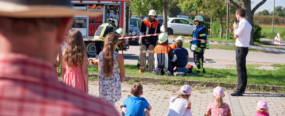 Bei der Schauübung stand in diesem Jahr eine technische Hilfeleistung auf dem Programm. Ein Jugendlicher war mit seiner Hand im Zaun stecken geblieben. Sein Freund setzte den Notruf ab woraufhin die Feuerwehr ausrückte um den jungen Mann aus der misslichen Lage zu befreien.